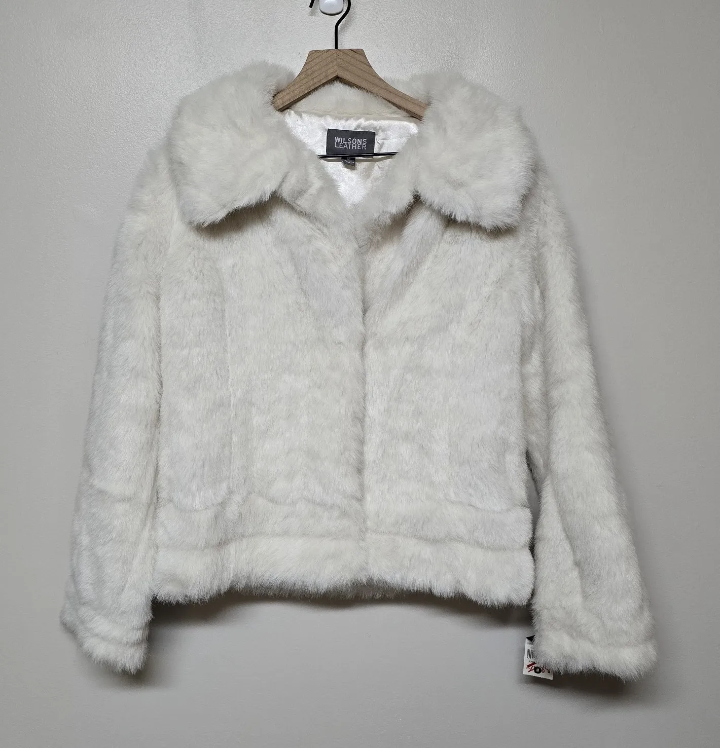 Brand: Wilsons Leather Size: Women's Medium Color: Ivory / White Material: Outer Shell: 100% Polyester (Faux Fur) Lining: 100% Polyester Style & Features: Luxurious plush faux fur exterior Soft, silky satin-style lining Classic fold-over collar Cropped jacket silhouette Full-length sleeves Warm, cozy, and stylish—perfect for fall & winter wear Elegant neutral color that pairs easily with many outfits Condition: NWT Chest (pit to pit): ~19" Length (shoulder to hem): ~25" (Measurements shown in photos; allow slight variance) Notes for Buyers: From a smoke-free environment Colors may vary slightly due to lighting and screen settings