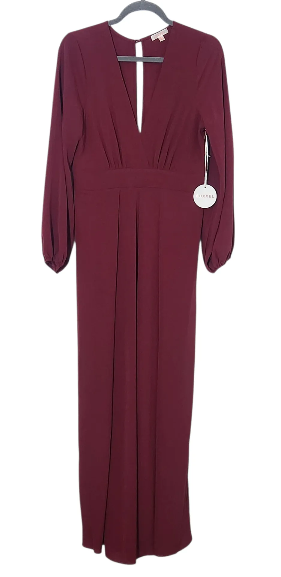 Luxxel elegant burgundy jumpsuit features long sleeves, a slit in the back, and a sash at the waist.... Show more