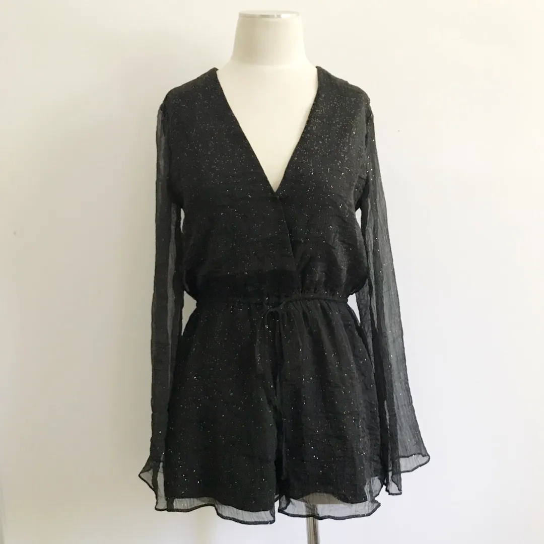 Gorgeous glitter romper with flared long sheer Sleeves, nice and flowing. Has clasp closure at neck... Show more