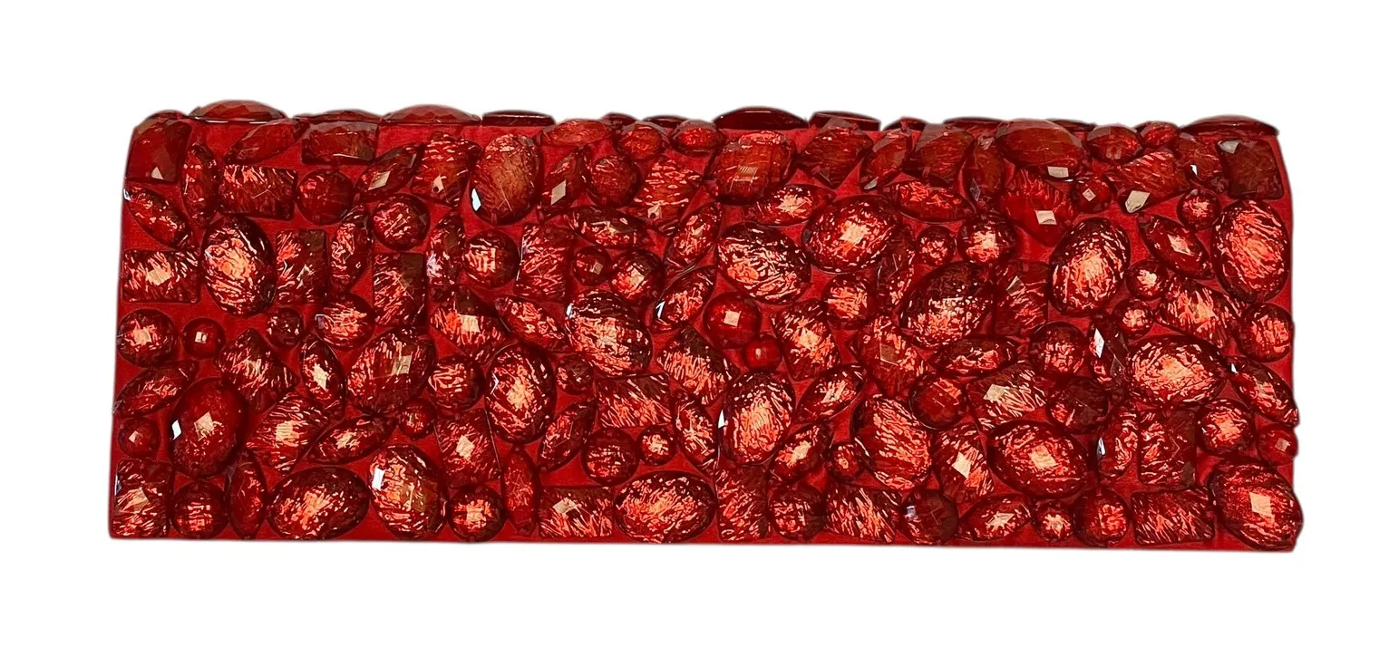 Gorgeous limited edition evening bag from the Banana Republic x L'Wren Scott Collection of 2013, the late designer's only RTW collaboration. Long red satin body hand beaded with sparkling red gem beads on front. Gunmetal hardware. Front flap with magnetic closure. Colorful striped lining with interior lip-shaped mirror. One inner pocket. Omega chain wrist strap tucks inside to convert from wristlet to clutch. Great preowned condition. No holes or stains. See all photos. 11" L x 3.5" H x 2.25" D Strap drop: 8"