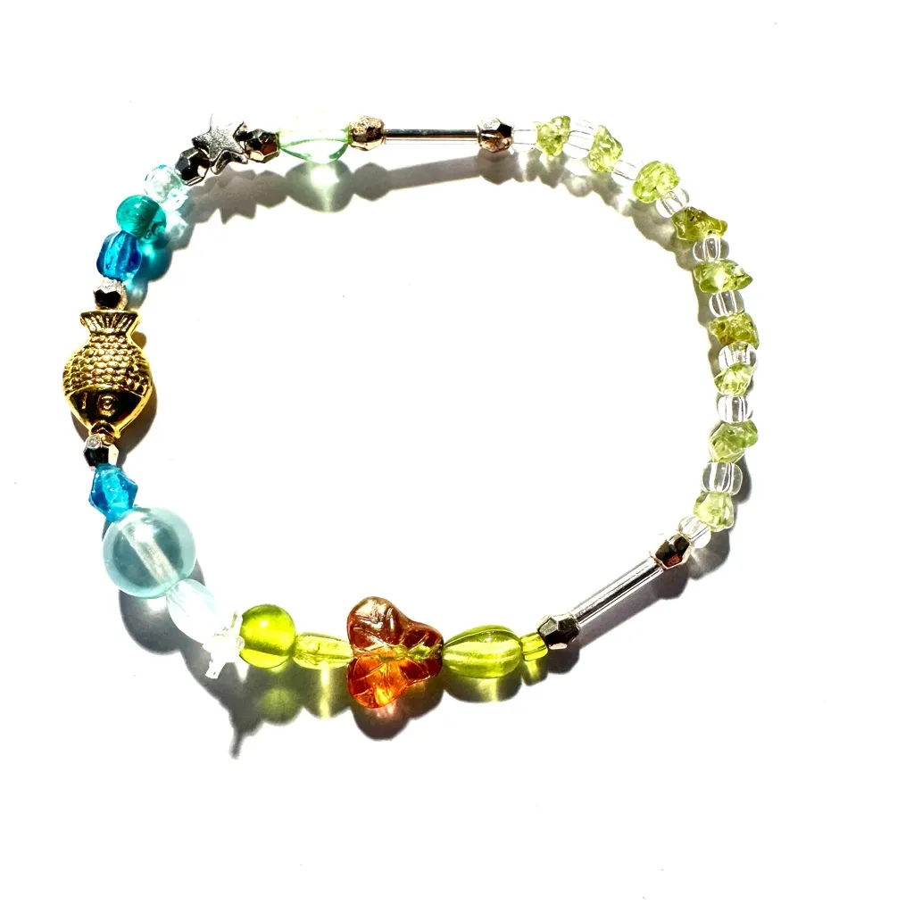 This delicate, yet sturdy stretch bracelet is handcrafted by myself, and features a sweet variety of beads. Czech glass, misc glass, seed beads, glass from India, and stunning genuine Peridot chip beads. A gentle statement piece, which makes a beautiful holiday or birthday gift, especially for those born in August. (Birthstone)