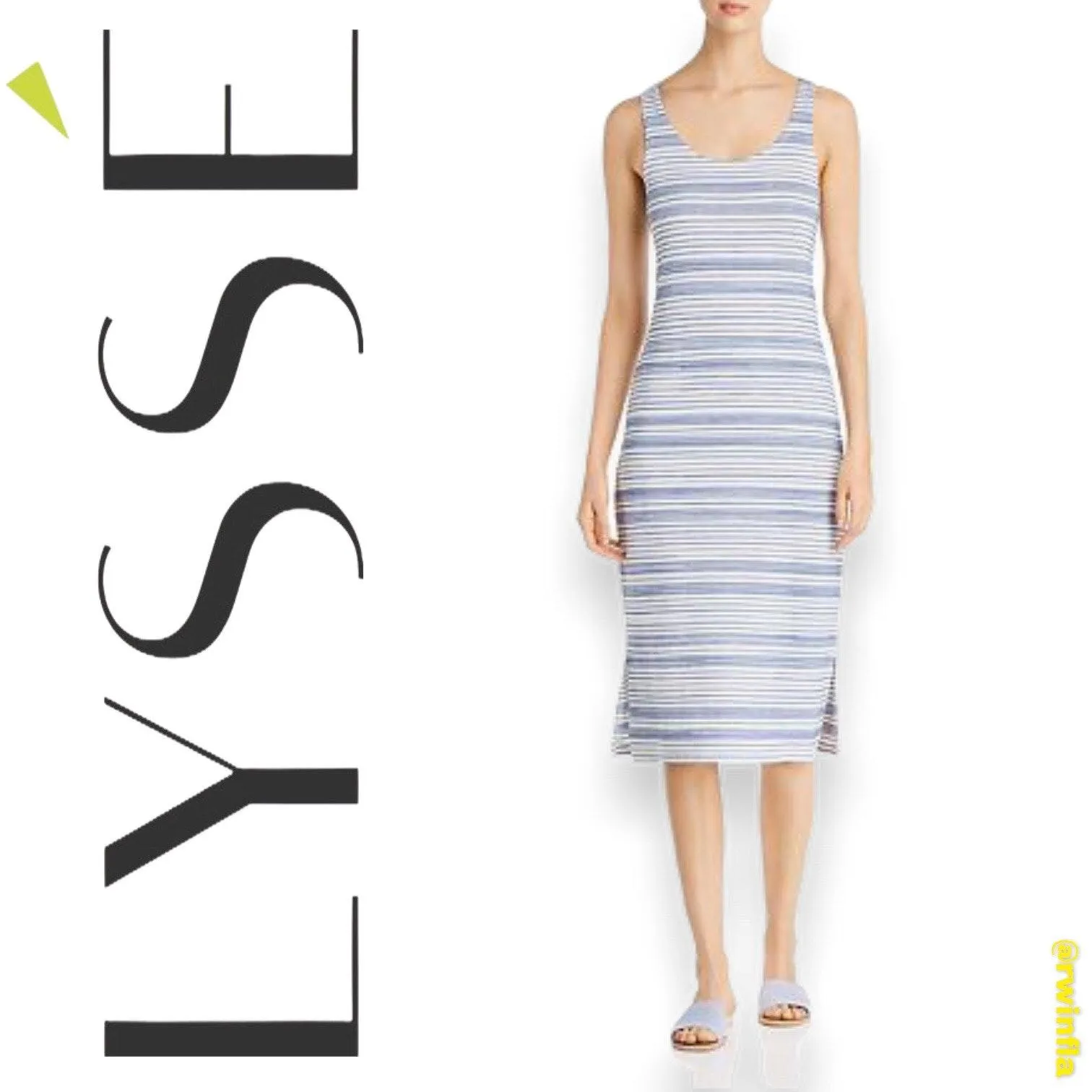 Lyssé Mulholland Striped Tank Dress Midi Women's Size Small NWT New Lysse knit dress. Color is blue and white. Size small. New with tags. Smoke free home. All measurements are approximate with garment laying flat: Armpit to Armpit - 15” Hips - 17.5" Overall Length (with straps) - 45.5" Style# 24-2133-M7 50% Rayon 47% Polyester 3% Spandex See photos for additional details