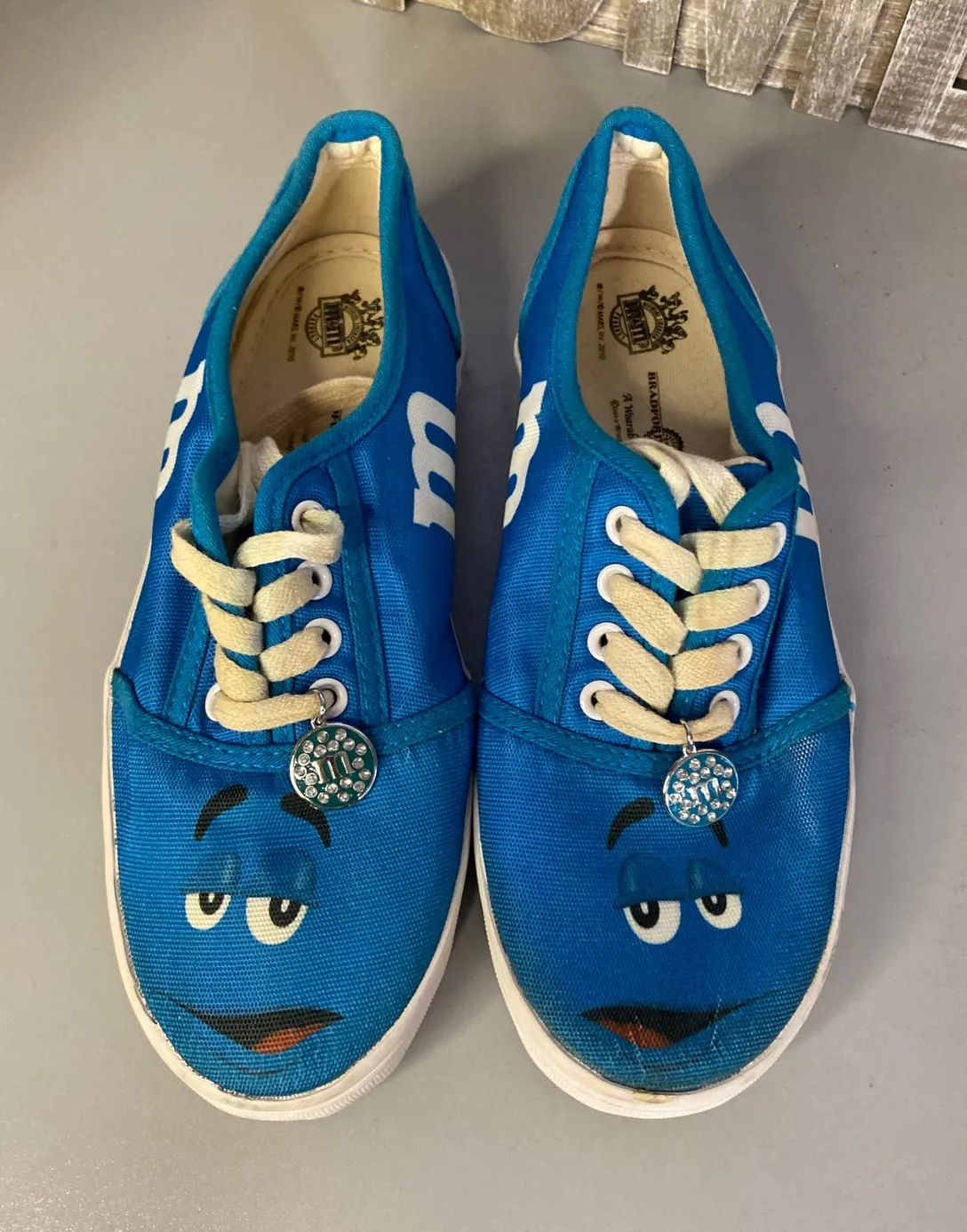 M&Ms cartoon character blue canvas sneakers for women. These playful shoes feature the iconic M&M character face graphic on the front with a white "m" logo on the side. Decorative M&M charms adorn the laces. Perfect for casual outings or adding a fun touch to a themed event. Department: Women UK Shoe Size: 3.5 Product Line: M&M's Theme: Cartoon, Letters, Numbers & Words, Funny Upper Material: Canvas Features: Limited Edition, Cushioned, Lightweight Shoe Width: Standard Character: Peanut Release Year: 2010 Accents: Medallion, Logo, Rhinestone Style: Sneaker Type: Athletic Keywords: M&Ms, cartoon, character, canvas, sneakers, womens, Bradford Exchange, casual, fun, novelty, footwear, shoes, collectible