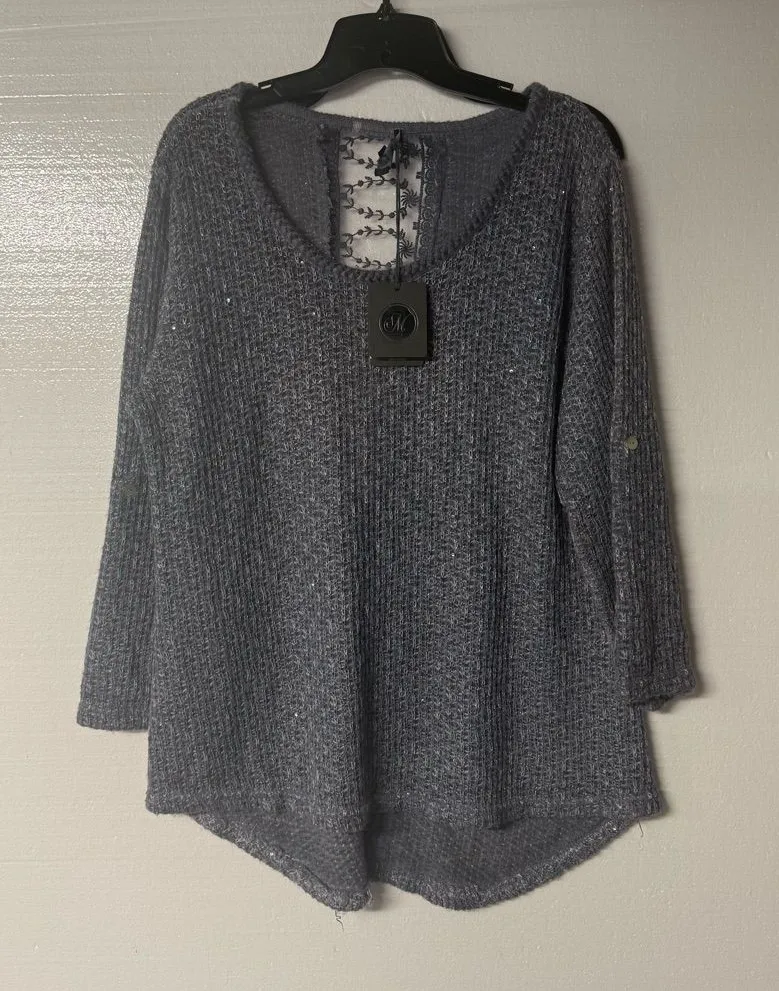 NEW M Made In Italy Sweater Women L Blue Knit Sparkly Sequin V Neck Lace Floral Back Size: large C... Show more