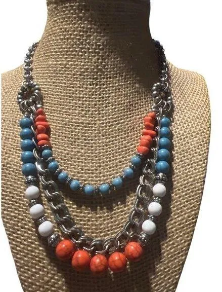 Enhance your style with this silver tone multi-strand necklace, featuring vibrant Southwestern colors of orange, blue, and white. Adjustable and layered, it's perfect for any occasion. • Silver tone finish • Multi-strand design • Southwestern colors • Adjustable length • Layered style Adjustable Measures approx. 15-18" Great preowned condition