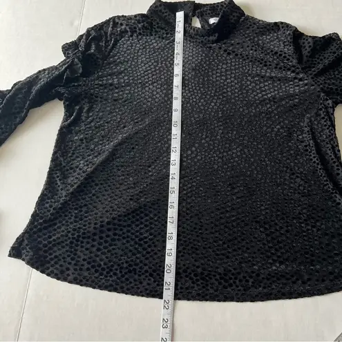 Avec Les Filles Size medium Black Mock neck long sleeve top with ruffle sleeves and keyhole cuffs, mock neck with keyhole double button closure on back. Semi sheer top with a velvet polka dot speckle pattern. Blouse is in excellent like new condition. Pit to pit 19.5” flat Length 21 3/4”