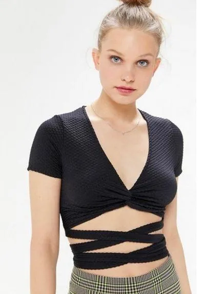 Super cute, comfortable and versatile wrap top from UO in a textured black. Excellent preowned con... Show more