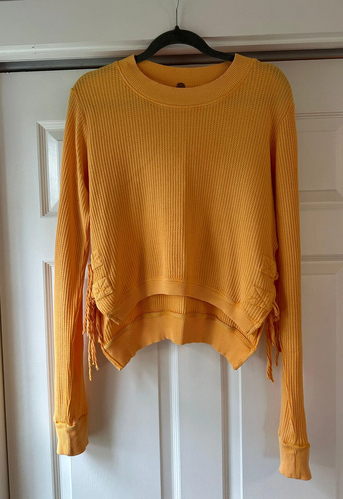 - long sleeve orange pull over - hits at/above waist - tie side details - worn once, in great cond... Show more