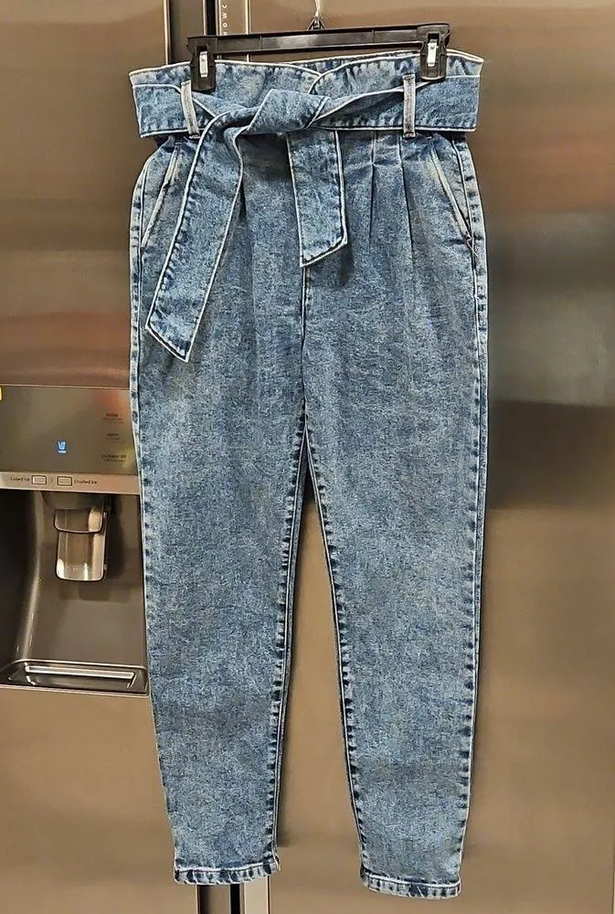 SEZANE Austin Denim Trousers Color: Bleached Blue Size: FR 36 Condition: New without tags High waisted ankle length trousers Belted paperbag cut Stitched pleats at the waist Zip and hook closure on the front Italian pockets and piped back pocket Organic material 98% Organic Cotton, 2% Elastane Made in Morocco Approximate Measurements: Waist 32" Front Rise 13.25" Inseam 28.25" Cuffs 11.5" French Girl Style Parisian Chic Casual Chic Minimalist Chic