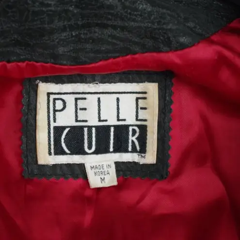 This listing is for a vintage Pelle Cuir Ladies' jacket. It is made of a black leather with a textured stripe pattern and a red satin lining lining. It has a cropped waist and moderately padded shoulders. This jacket has some signs of fading and small signs of wear but no rips, hardware or lining issues. Size marked is Medium. Approximate Measurements: Sleeve Length: 20.75" Armpit to Armpit: 19.5" Collar Seam at top of shoulder to bottom of jacket: 19"