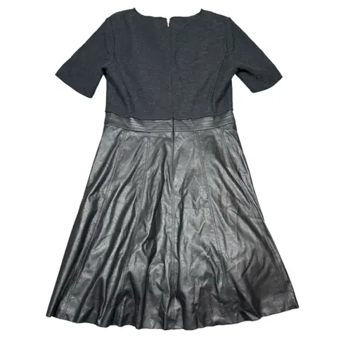 Chic and timeless Rebecca Taylor fit & flare dress featuring a textured black bouclé knit bodice and a supple faux leather skirt. Classic crew neckline, short sleeves, and flattering pleated A-line silhouette. Perfect for work, events, or a night out. • Size: 12 • Color: Black • Bodice: 58% cotton / 35% polyester / 5% polyamide / 2% elastane • Skirt: 85% polyester / 15% polyurethane • Lining: 100% polyester • Back zip closure • Style: Bouclé & Faux Leather Fit & Flare • Retail: $495 Condition: Gently worn, light wrinkling to faux leather skirt from storage (should smooth with proper care). No major flaws. Style Tags: cocktail, holiday, party, edgy, classic, workwear, fall fashion, winter style, black dress, elevated basics