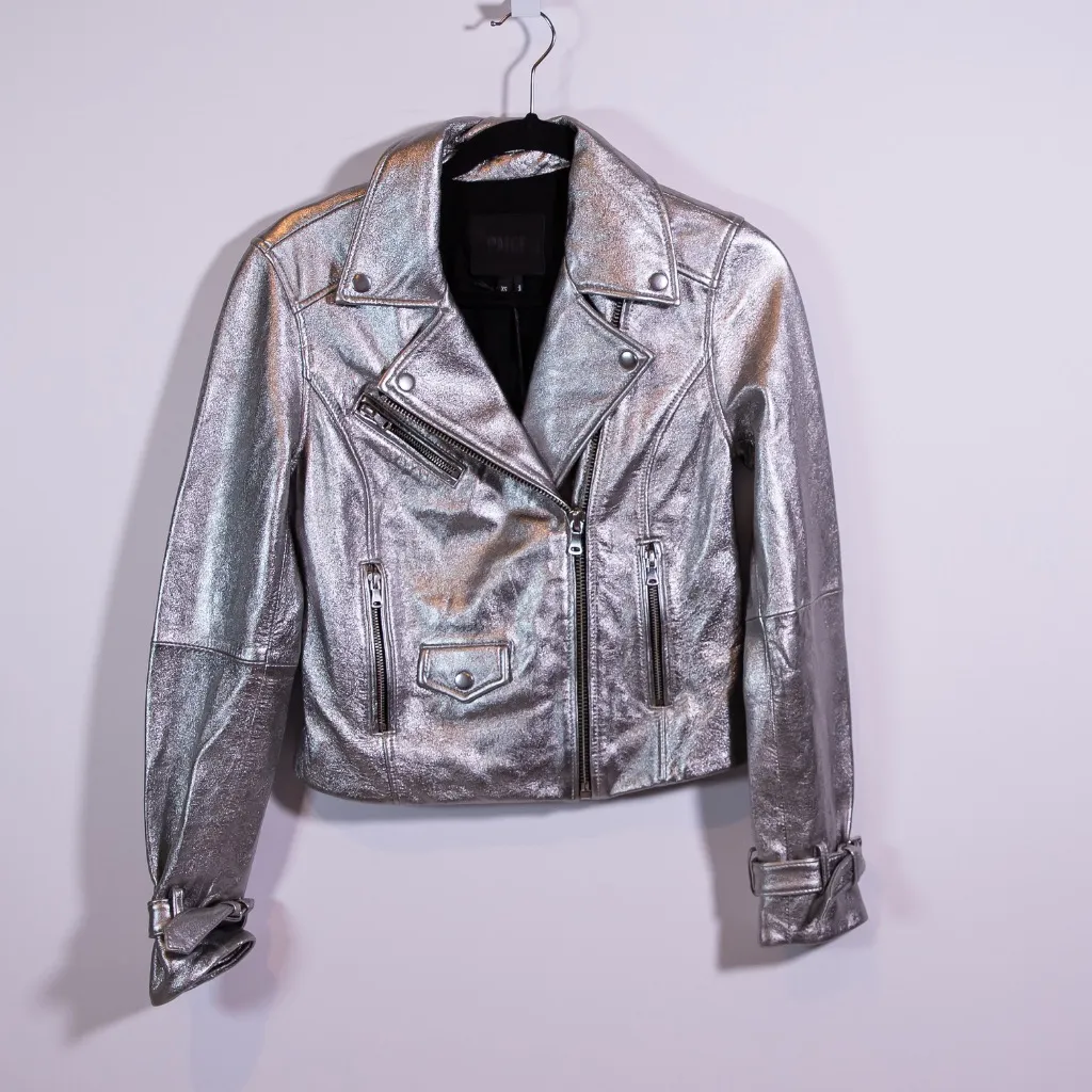 NEW Paige Ashby Metallic Genuine Leather Full Zip Motorcycle Jacket Silver XS Snap-down spread collar Long sleeves Adjustable buckle-tab cuffs Asymmetric zip front closure New with tags! [Sperling]