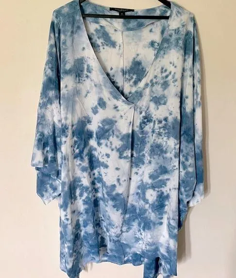 Brand: Marc New York by Andrew Marc Size: 3X Condition: excellent preowned condition Description: Oversized, soft and silky blue and white tie dye top of 100% rayon. This beachy, boho top is cute with white jeans, leggings or even as a cover up.