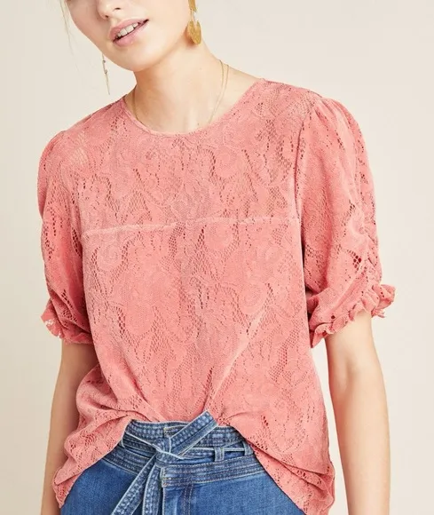 Anthropologie Lace Blouse With Ruched Sleeves Womens Size Small. Feminine Boho. Featuring ruched sl... Show more