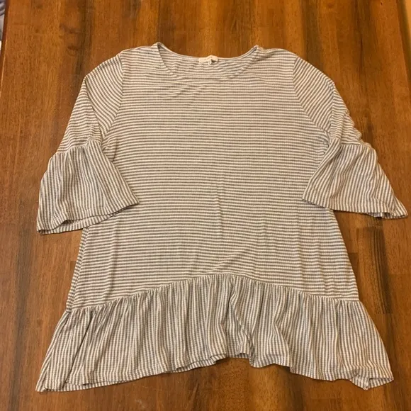 Anthropology Pleione stripe top XL gray white 3/4 flutter sleeves / hem peplum - $23 - From Tiffany