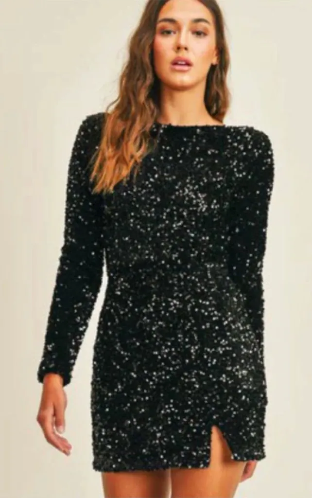 Because every party needs a stand-out, and this dress is the one! Excellent Preowned condition. Size Medium. -Black sequin mini dress by Mable. - Long sleeve -Sequin bodycon dress -Open back and self tie detailing -Front side mini slit -Lined -Stretchy -Content: 100% Polyester -Hand wash/Line dry -Imported -Runs true to size Approximate measurements Bust 17” but stretchy Waist 14.5” - has stretch Length 32.5”-33”