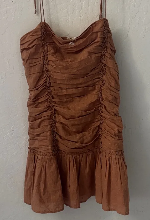 Mable Brown Camel Tan Polka Dot Ruched Mini Dress Tie Straps Large Bodycon - $30 - From Audrey