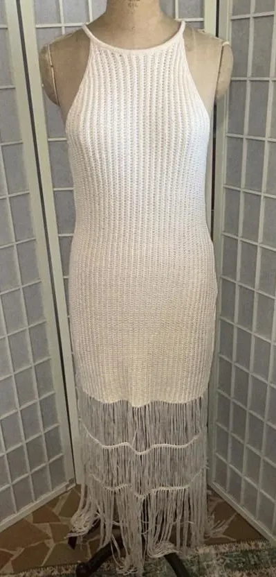 Mable Crochet Ivory Boho Hippie Beach Minimalist Bodycon Maxi Dress in USA Women’s Size Large, in go... Show more
