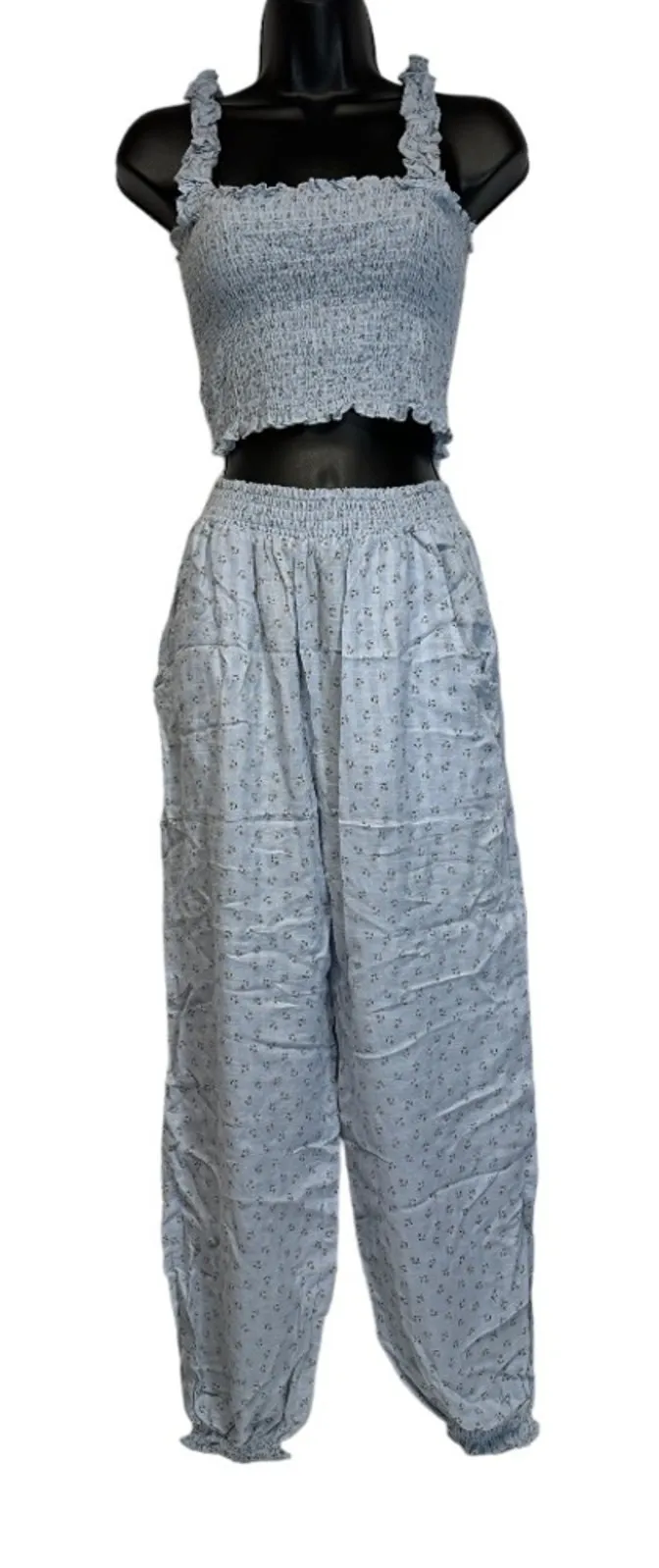 Mable Light Blue Floral Print Sleeveless Crop Top and Jogger Pants Set Top: Sleeveless Ruffle detail... Show more