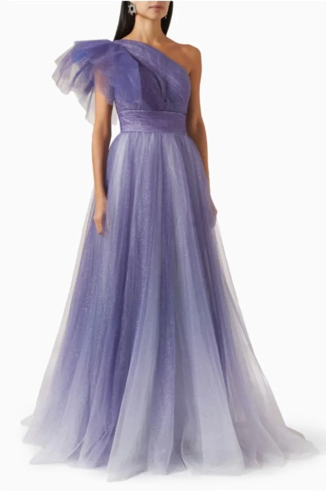 Brand: MAC DUGGAL Tag size: 2 Made in China Color: Purple with glitter shimmer Design: One-shoulder ruched bodice with dramatic tulle/mesh ruffle detail Silhouette: Full-length gown with layered tulle skirt and satin-like lining Closure: Side zipper Occasion: Prom, evening, formal, gala, bridesmaid Notes: Security tag visible in photos; hanger not included