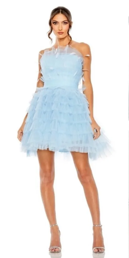 Mac Duggal Tulle Fabric (100% Polyester) Fully lined Strapless neckline Sleeveless Feather bustier detail Concealed back zipper Approx. 35" from top of shoulder to bottom hem Available in Powder Blue Style #20529