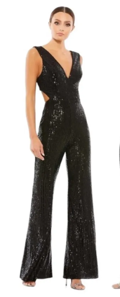 On sale is a Mac Duggal 26691 Sequin V Neck Cut Out Jumpsuit Women Black Wedding Cocktail 12. It is new without tags. The measurements are approximations Length (Shoulder to hem)- 61 1/4 inches Width (Pit to pit)- 18 inches Waistline- 17 3/4 inches Inseam- 33 inches