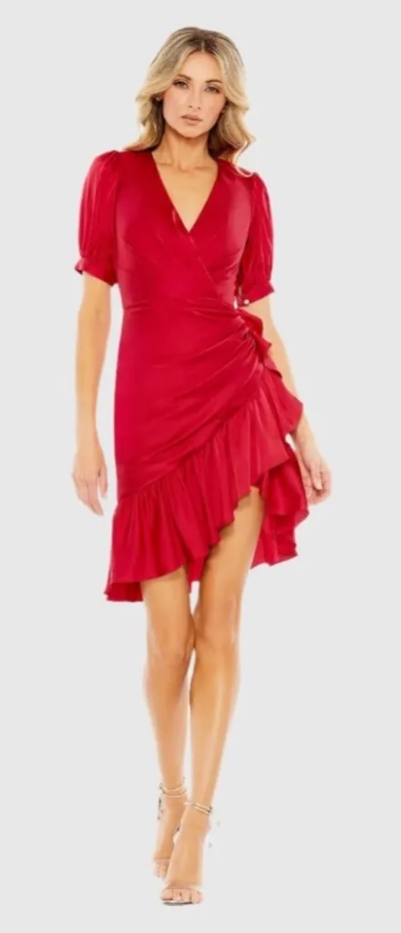 NWT 36” length 14.5” pit to pit Perfect for any daytime occasion, this mini dress feature short puff sleeves and a charming asymmetrical ruffle hem. leena for Mac Duggal Charmeuse fabric (100% polyester) Fully lined V-neck Short puff sleeves Faux wrap bodice Asymmetrical hem Concealed back zipper Approx. 33" from top of shoulder to bottom hem Available in Rusty Red Style #26928 Wedding, mother of the bride, mother of bride, mother of the groom, mother of groom, MOB, MOG, bridesmaid, bride, gown, dress, stunning, dresses, clothes, fashion, luxury, sequins, fashion designer, discount, discount dresses, wedding guest, gala, soirée, night out, dinner dress, formal event, black tie, black tie event, fundraiser dress, prom, medical ball, medical school ball gown, medicine ball, Army Ball, Marine Ball, Marine Corps Ball, Air Force Ball, Holiday Party, work party, pageant E1