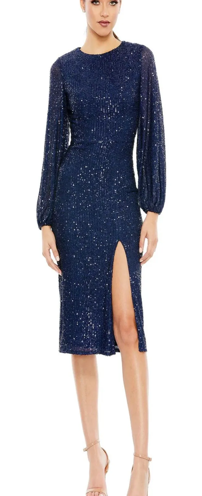 Mac Duggal 42018 Slit Skirt Sequin Dress Size: 6 Color: Midnight (dark blue) Retail: $358 Mac Duggal 42018 midnight blue knee-length dress features a slim silhouette in allover sequins, with a jewel neckline and three-quarter bishop sleeves. A thigh-high slit accents this short evening dress, finished with a full zipped-up back. Pet-free, smoke-free home. NEW WITH TAGS - NEVER WORN No flaws Ships quickly! mother of the bride, mother of the groom, wedding guest, cocktail, new years eve, nye, party