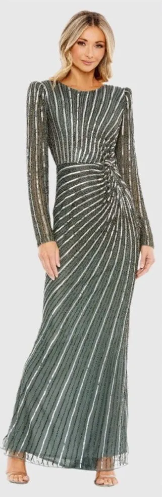 -New without tags. The wear and return prevention tag is still attached. *There is a small tear on the back of the skirt, approximately 3/4 of the way down. Please view pics. Retail $598 Details: Made in an ultra-fine tulle fabric, this floor-grazing dress is embellished with rays of sequins. A sleek column shape with a high neckline and fitted long sleeves delivers a chic, contemporary look, while a beaded belt encircles your waist for a flattering fit. Mac Duggal Size: 8 Color: Grayish-Green Sequin-embellished mesh fabric (100% polyester) Fully lined High neckline Semi-sheer long sleeves Beaded waist detail Concealed back zipper Approx. 60" from top of shoulder to bottom hem Style #5641 Approximate Measurements: Underarm to underarm: 18.5” Across waistband: 15” macduggal party gown black tie prom pageant wedding guest special occasion event charity gala military ball fire and ice cruise sexy glamourous birthday special occasion sorority formal photoshoot photo shoot engagement evening party celebrity red carpet classic elegant jeweled old hollywood ballgown bar mitzvah bat mitzvah debutante designer vacation cocktail homecoming mother of the bride groom motb weddings full floor tea length textured brocade banquet award ceremony romantic feminine bridal bridesmaid holiday new years eve opera long stunning bridal shower jeweled jewel sequin sequined