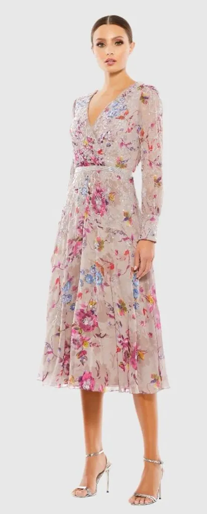 Mac Duggal 9147 Multicolor Hand Embellished Floral Long Sleeve Midi Dress Size 4 NWT. Discover timeless elegance with our Long Sleeve Midi Dress, crafted from hand-embellished floral printed fabric. This enchanting dress features a flattering V-neckline, long bishop sleeves, and a faux wrap bodice for a feminine silhouette. * New with tags! * Hand-embellished floral printed fabric (100% polyester) * Fully lined through body; semi-sheer unlined sleeves * V-neck * Long bishop sleeves * Faux wrap bodice * Beaded waist detail * Intricate floral beading along bodice, sleeves and skirt * Concealed back zipper * Approx. 48" from top of shoulder to bottom hem * Available in Mauve Multi * Style #9147 Tags: Prom, homecoming, formal, wedding, bridal party, mother of the bride, mother of the groom, maid of honor, bridesmaid, wedding guest, engagement, pageant, evening gown, ball gown, gala, soirée, black tie, fundraiser, military ball, army ball, navy ball, air force ball, marine corps ball, coast guard ball, red carpet, quinceañera, sweet 16, special occasion, cocktail party, holiday party, charity event *OFFERS WELCOME!*