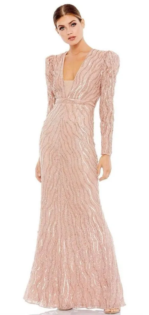 . Elegant puff sleeve trumpet gown adorned with sequins and beading throughout. Plunging v-neckline features a semi-sheer mesh inset, and an embellished waistband defines the waist. * Beaded fabric (100% polyester) * Fully lined body; unlined sleeves * V-neck * Long sleeves * Back zipper * Approx. 61" from top of shoulder to bottom hem * Available in Mocha * Style #93574 Tags: Prom, homecoming, formal, wedding, bridal party, mother of the bride, mother of the groom, maid of honor, bridesmaid, wedding guest, engagement, pageant, evening gown, ball gown, gala, soirée, black tie, fundraiser, military ball, army ball, navy ball, air force ball, marine corps ball, coast guard ball, red carpet, quinceañera, sweet 16, special occasion, cocktail party, holiday party, charity event *OFFERS WELCOME!*