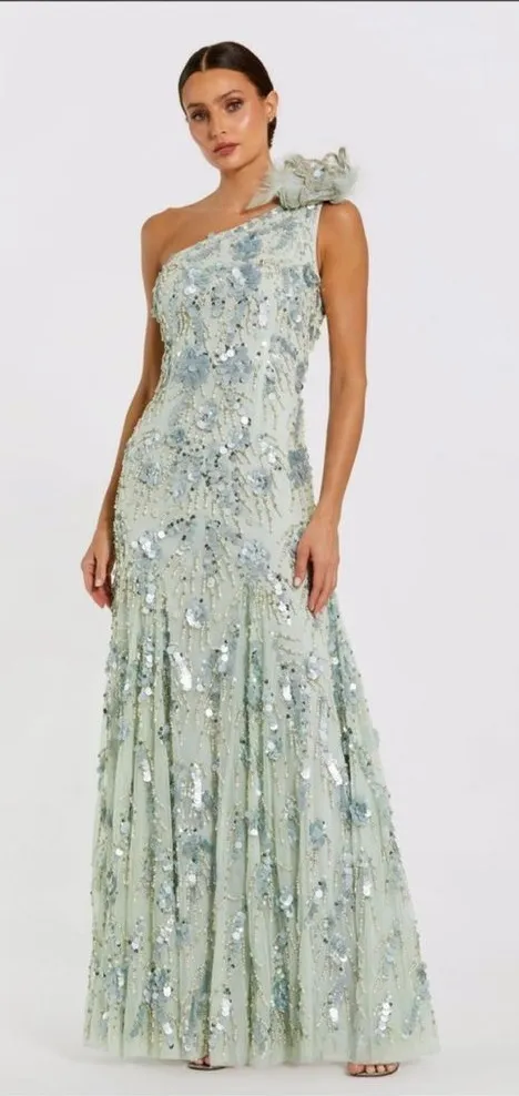 MAC DUGGAL 94151 Green Embellished One Shoulder Trumpet Gown with Flower -New with tags -Retail $698 Details: This ethereal trumpet gown, embellished with delicate sequin, pearl, and beaded details, features a graceful silhouette and a feathered flower accent, radiating timeless glamour—perfect for weddings, galas, and unforgettable occasions. Mac Duggal Size: 2 Embellished mesh fabric; 100% polyester lining Fully lined bodice Asymmetrical one shoulder neckline Exaggerated flower detail Jewel encrusted embellishments Allover paillette sequins Approx. 61" from top of shoulder to bottom hem Available in Sage Style #94151 Approximate Measurements: Underarm to underarm: 16.5” Across waistband: 14” macduggal party gown black tie prom pageant wedding guest special occasion event charity gala military ball fire and ice cruise sexy glamourous birthday special occasion sorority formal photoshoot photo shoot engagement evening party celebrity red carpet classic elegant jeweled old hollywood ballgown bar mitzvah bat mitzvah debutante designer vacation cocktail homecoming mother of the bride groom motb weddings full floor tea length textured brocade banquet award ceremony romantic feminine bridal bridesmaid holiday new years eve opera long stunning bridal shower jeweled jewel sequin sequined