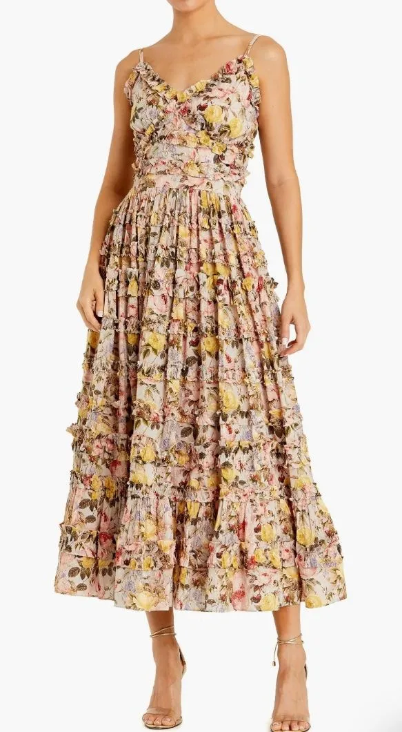 Mac Duggal Beige Floral Print Ruffle Tiered Midi Dress Size 10 Pink - $200 - From Miriam
