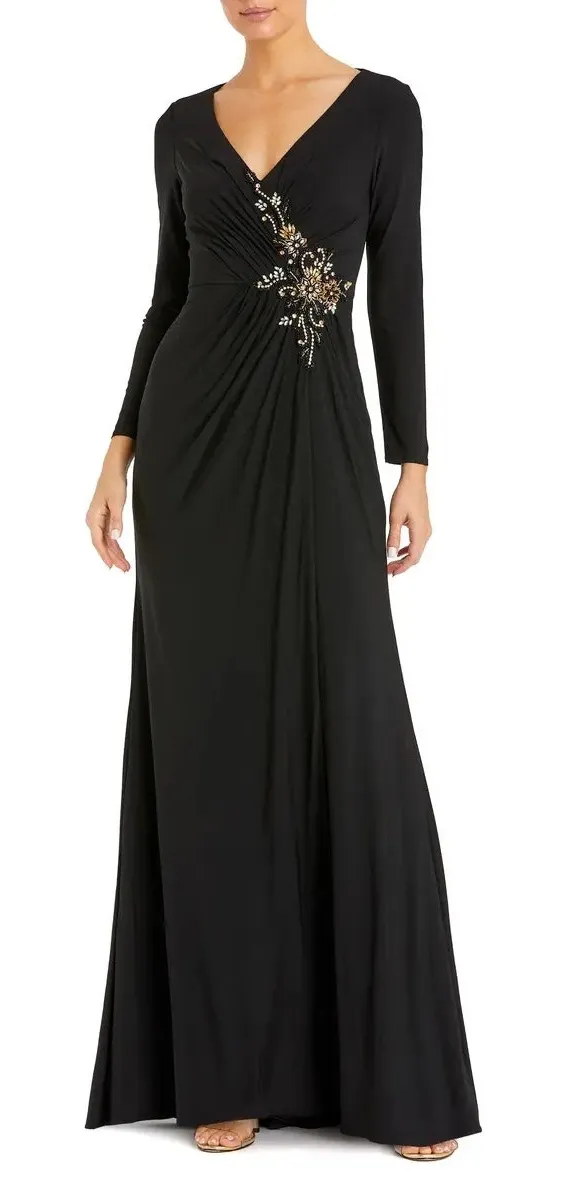 New without tags. Size: 14 Approximate measurements with garment laying flat: 21” bust, 20” waist, 60” front length, 68” back length Color: Black This elegant gown features a V-neck, long sleeves, ruched bodice, and intricate beading with rhinestone appliqué, perfect for formal occasions and special events. Concealed back zipper V-neckline Long sleeve Lined OFFERS WELCOME BUNDLE & SAVE MORE SAME OR NEXT DAY SHIPPING ITEMS PACKAGED WITH CARE