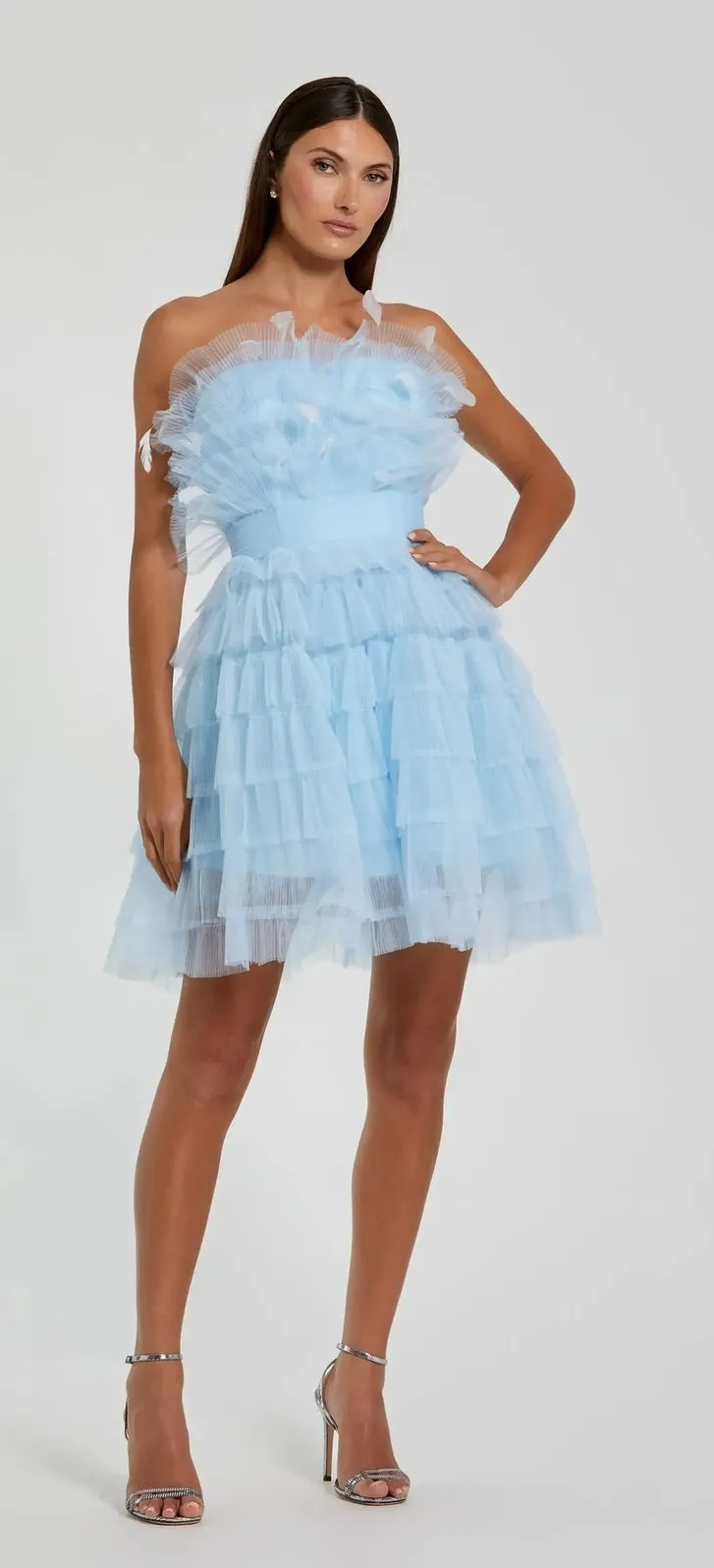 Mac Duggal Blue Feathered Strapless Tulle Fit & Flare Formal Mini Dress - Size 8, new with tags! Purchased a few dresses for an event and wound up not using this one. Way past my return timeline so my loss is your gain! :) Crafted from delicate tulle, this dress features feathered detailing that adds a touch of movement. The strapless design enhances your silhouette, while the fit and flare silhouette create a flattering shape. Perfect for formal events or special occasions, this dress is sure to make a statement and leave a lasting impression. Tulle fabric (100% polyester) Fully lined through body Strapless neckline Sleeveless Feather bustier detail Concealed back zipper Approx. 35" from top of shoulder to bottom hem ethereal, fairycore, balletcore, princesscore, soft glamour, romantic occasion, modern fairytale, special event, statement silhouette, couture inspired, whimsical, dreamy aesthetic, luxury occasionwear, party season, cocktail hour, wedding guest, promcore, birthday outfit, editorial look, elevated feminine, cloudcore