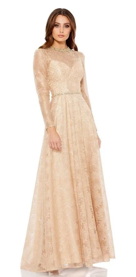 This MacDuggal formal evening gown is designed for women seeking elegance and sophistication. It features a long A-line silhouette in a striking gold color, crafted from lace and rhinestone materials. The dress has a round neckline with beaded accents at the neck and waist, and long sleeves. It is suitable for formal occasions such as galas, weddings, or black-tie events. The gown has a zip closure. New with tags! Brand: MacDuggal Size: M Style: A-line, Formal Dress length: Long Color: Gold Department: Women Sleeve length: Long Sleeve Occasion: Formal Material: Lace, Sequin Neckline: Round Neck Closure: Zip Accents: Beaded Neckline, Beaded Waist Features: Elegant, Sophisticated Style No: 49188 Retail: $598 Chest: 21” across Waist: 19” across Hips: 25” across Length: 64” New with tags! Smoke-free, pet-free. Ships within 1 to 2 business days. Save the planet. Shop second hand.