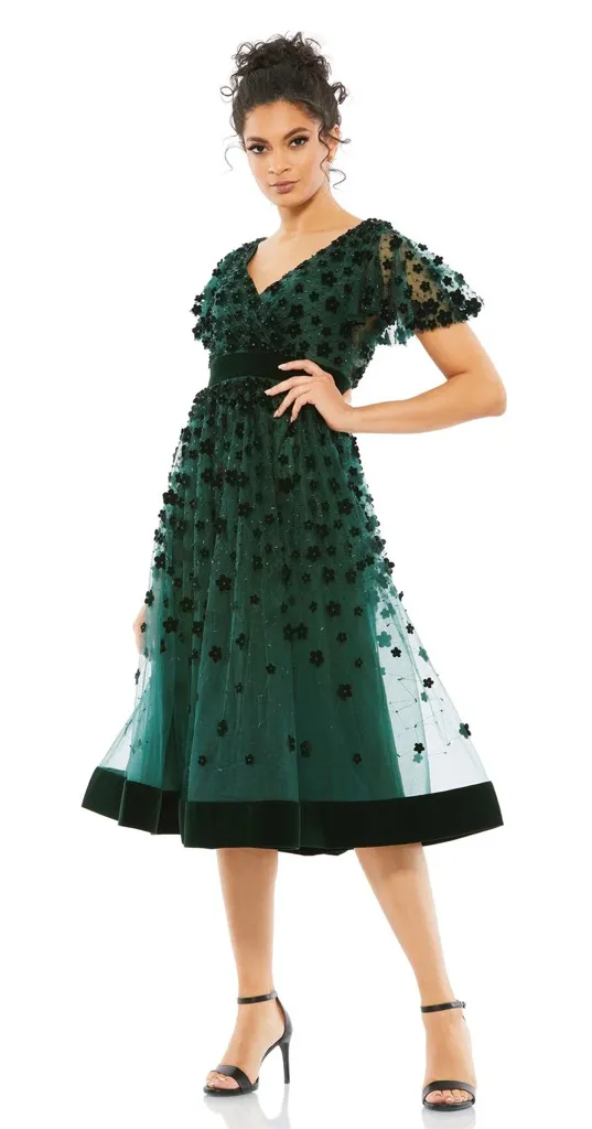 Mac Duggal Hand-embellished mesh overlay; 100% polyester lining Partially lined bodice; fully lined skirt; sheer unlined sleeves V-neckline Short butterfly sleeves Velvet cummerbund and hem All-over floral appliqué and beaded embellishments Concealed back zipper Approx. 48" from top of shoulder to bottom hem Available in Emerald Green, Burgundy, and Black Style #67854