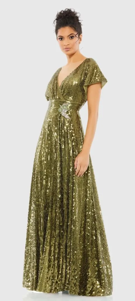 Covered in high-shine sequins, this floor-length gown is a lesson in how to make a beautiful, bold impression. Made to dazzle in any season, the floor-sweeping dress is styled with a surplice neckline, Nuttery sleeves that offer upper arm coverage, and a lavish rhinestone brooch at the waist. • Mac Duggal • Embellished mesh fabric (100% polyester) • Fully lined through body • V-neckline • Short sleeves • Rhinestone brooch at the waist • Concealed back zipper • Approx. 60" from top of shoulder to bottom hem • Available in Olive • Style #10773 MSRP 398.00