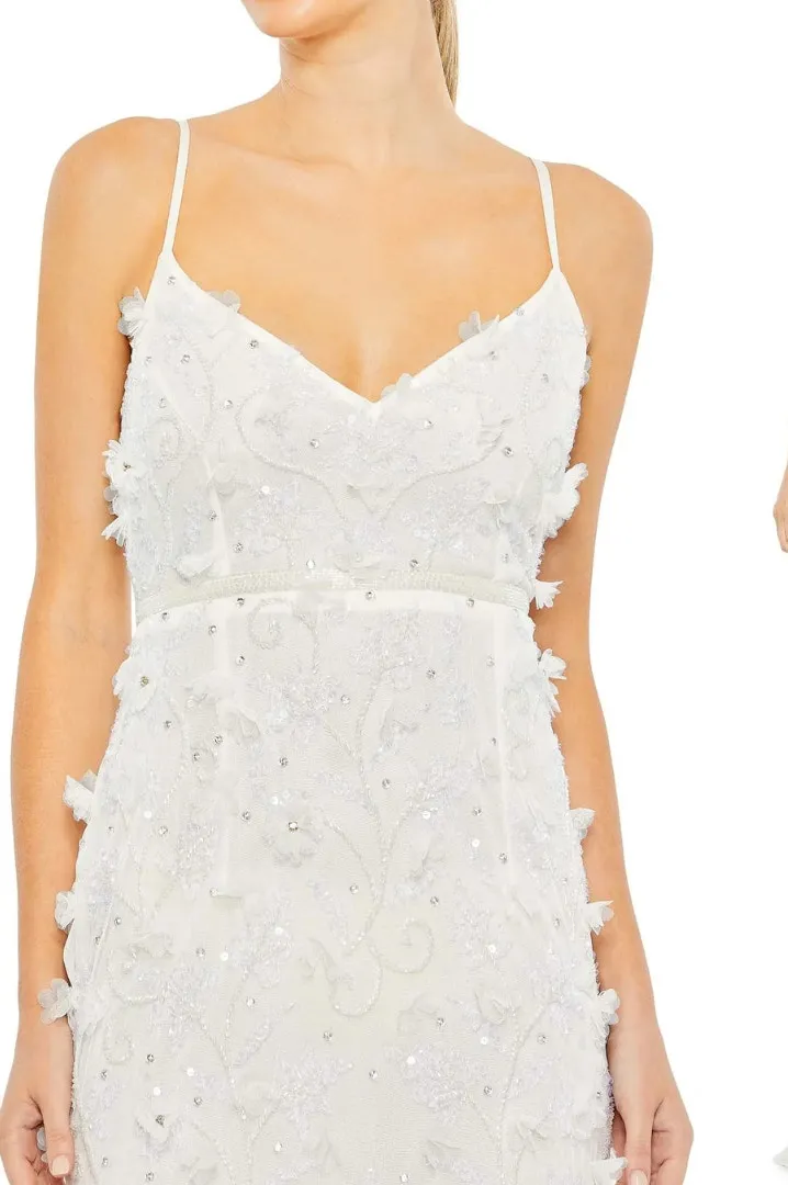 Mac Duggal Floral Applique Gown in White. Size 4. Features sleeveless bodice, V-neckline, delicate spaghetti straps, open back, sequin embellished waistband, and a subtle sweep train. Fabric: 100% polyester. Style # 93686. NWT / New with tags. Retails $598. Tags: bridal, wedding, floral, flowers, formal, gala, event, special occasion, prom, applique, beaded Chest: 15” Length: 62” (Measurements are taken flat)