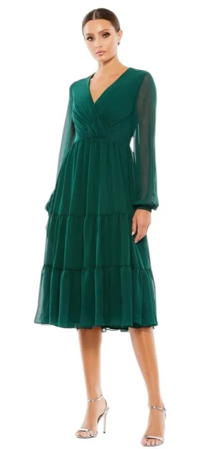 Mac Duggal NEW Size 0 Green Style 55637 Surplice Bodice Layered Midi Skirt Dress Ieena for Mac Duggal 55637 emerald tea-length dress is styled in luxe chiffon, featuring a ruched surplice bodice with a V-neckline and bishop sleeves. This A-line short dress finishes in a gathered tiered skirt. Has the red return preventino tag ensuring this dress has not been worn. Directions on how to remove this at home are included. Once removed, it cannot be reattached. Approximate Measurements Lying Flat: Pit to Pit: 14.5" Waist: 12.5" Length Shoulder to Hem: 44.5" Wedding Cocktail dress mother of the bride MOB Mother of the groom MOG ball MacDuggal Gown Dress Black Tie Formal Luxury Prom Homecoming Pageant Gala Ball Photo Shoot NYE Holiday Christmas Emerald Green