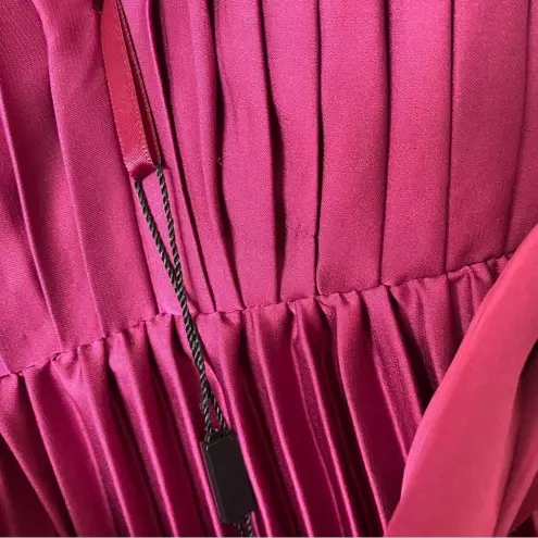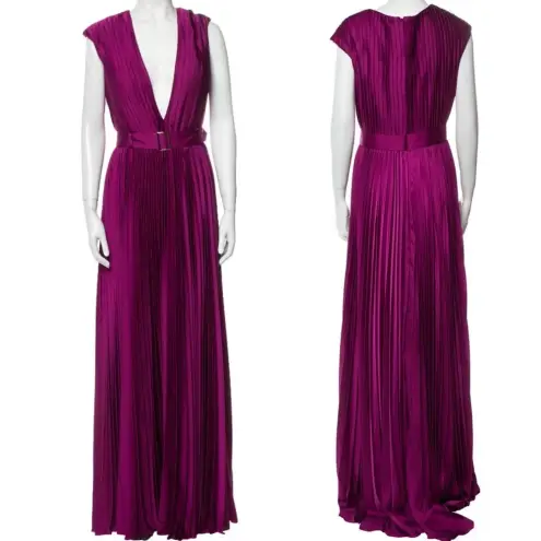 PLEATED PLUNGE NECK BELTED SATIN GOWN •Very light pulling last picture •color is closest to second... Show more