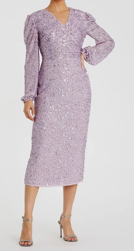 Sequined surplice cocktail dress with a faux-wrap v-neckline, long puff-shoulder blouson sleeves, and a chic midi-length skirt with a center back vent slit. Mac Duggal Fully lined Sequin fabric (100% polyester) V-neck Long sleeves Concealed back zipper Pit to pit ~20in Waist ~16.5in Length ~48.5in