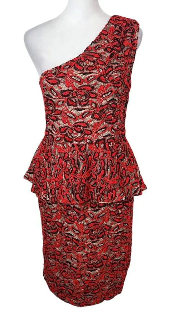 Madam X red lace dress with black accents and nude lining. One shoulder with peplum and back zipper.... Show more