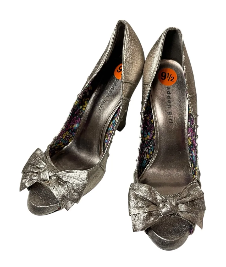 MADDEN GIRL Silver Block High Heels with Open Toe & Bow Accent Size: 9.5 Heel Height: 4” Metallic s... Show more