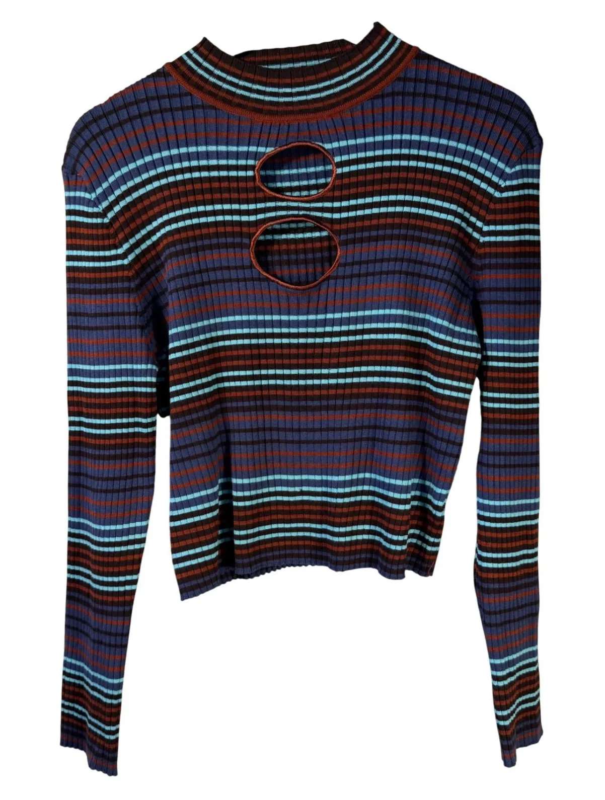Stylish ribbed knit top by Madden NYC featuring a bold multicolor stripe pattern and modern front cutout detail. Designed in a soft, stretchy ribbed knit with long sleeves and a slightly cropped silhouette. A great statement piece for casual wear, Y2K-inspired outfits, or layered looks. Measurements (Approx. – Laying Flat) • Pit to Pit: 20" • Length: 20" • Size Tag: XXL • Color: Multicolor (navy, brown, rust, teal) • Style: Ribbed knit top • Sleeve: Long sleeve • Neckline: Mock neck • Features: Front cutout detail, stretch fabric • Fabric: 68% Rayon, 32% Polyester • Made in China Condition: Very good pre-owned condition. No holes, stains, or noticeable flaws. Y2K • Retro • 90s Inspired • Ribbed Knit • Statement Top • Indie • Grunge • Casual Chic • Fall Colors • Festival • Street Style