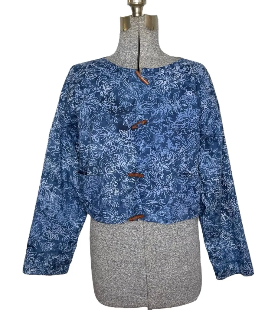 . No size but measures like a size large (I wear a size 12 and it fits me well). In good preowned condition with some light marks on the inside lining. Brand is “One Of A Kind”. Wooden toggle & loop front closure. 100% cotton and is lined inside, which makes it feel like a heavier cotton. Long sleeves. Blue and white in color with a tie dye like effect. Measurements laid flat in inches -chest 23 -length 19 -sleeve 18.5 from pit to cuff Bin I