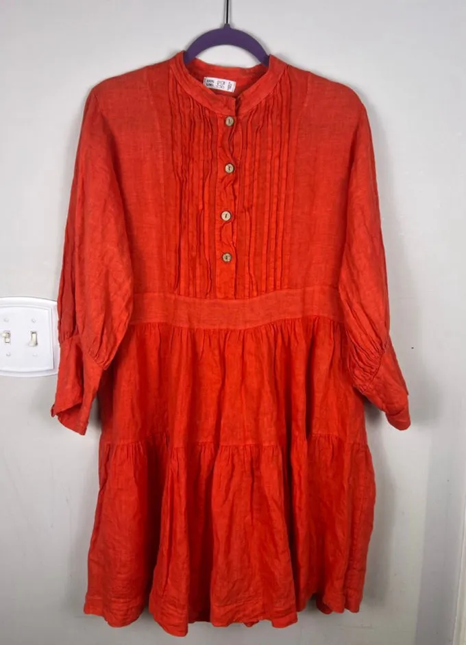 Women’s Made in Italy linen dress in a soft coral color. Made from breathable 100% linen, this dress features a button-front bodice with pintuck detailing, tiered skirt, and 3/4 sleeves with button cuffs. Comfortable, airy, and perfect for spring and summer wear. Features: • Made in Italy • 100% Linen • Color: Coral/Orange • Button front • Pintuck detail • Tiered skirt • 3/4 sleeves with button cuffs • Relaxed fit Size: One Size (TG U) Please see measurements for fit. Measurements (approx., taken flat): • Bust (pit to pit): 19” • Waist: 18” • Length (shoulder to hem): 36” Condition: Very good pre-owned condition. Please note: there is a small pinpoint stain on the front of the dress, shown clearly in photo #3. No holes noted. Natural linen texture and light wrinkling present, as expected.