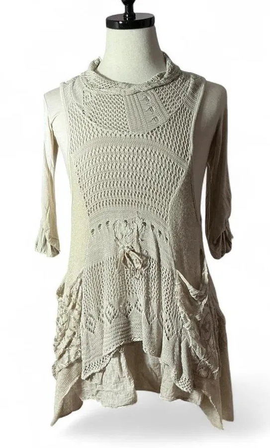 Italian made tunic dress in beige featuring intricate crochet and lace detailing. This piece showcases an asymmetrical hemline, adding a unique modern flair. It includes convenient front pockets and roll-tab sleeves for versatile styling. The neckline has a beautiful textured knit. Dress this piece up for a special occasion or wear it for a chic casual look. Two piece tunic top, the top that goes underneath has a very faint stain Keywords: Italian fashion, crochet dress, lace dress, tunic top, boho chic, designer, asymmetrical, pockets, beige, women's fashion, artisanal, statement piece, unique design, lightweight #HandKnit #Vintage #Cozy #Crochet #Feminine