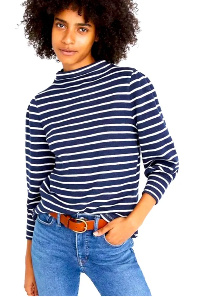 Madewell Gathered-sleeve Mockneck Sweater in navy and white stripes, size Small. This cozy and styli... Show more