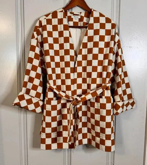 Stylish checkered jacket. Features a tie belt. Perfect for layering.